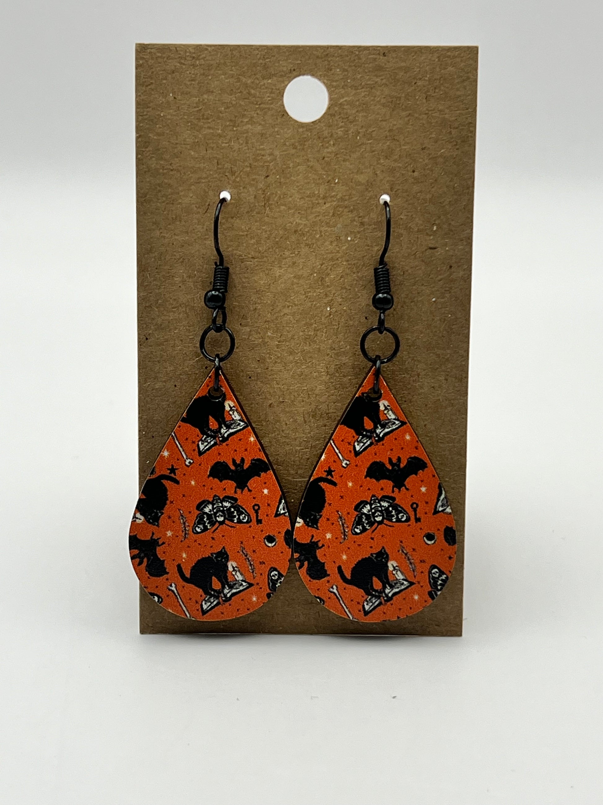 Add some spooky style to your wardrobe with these Black Cats and Bats UV Printed Earrings. These unique orange teardrop earrings feature charming black cats, eerie bats, and enchanting moths. Perfect for adding a touch of Halloween fun to any outfit!