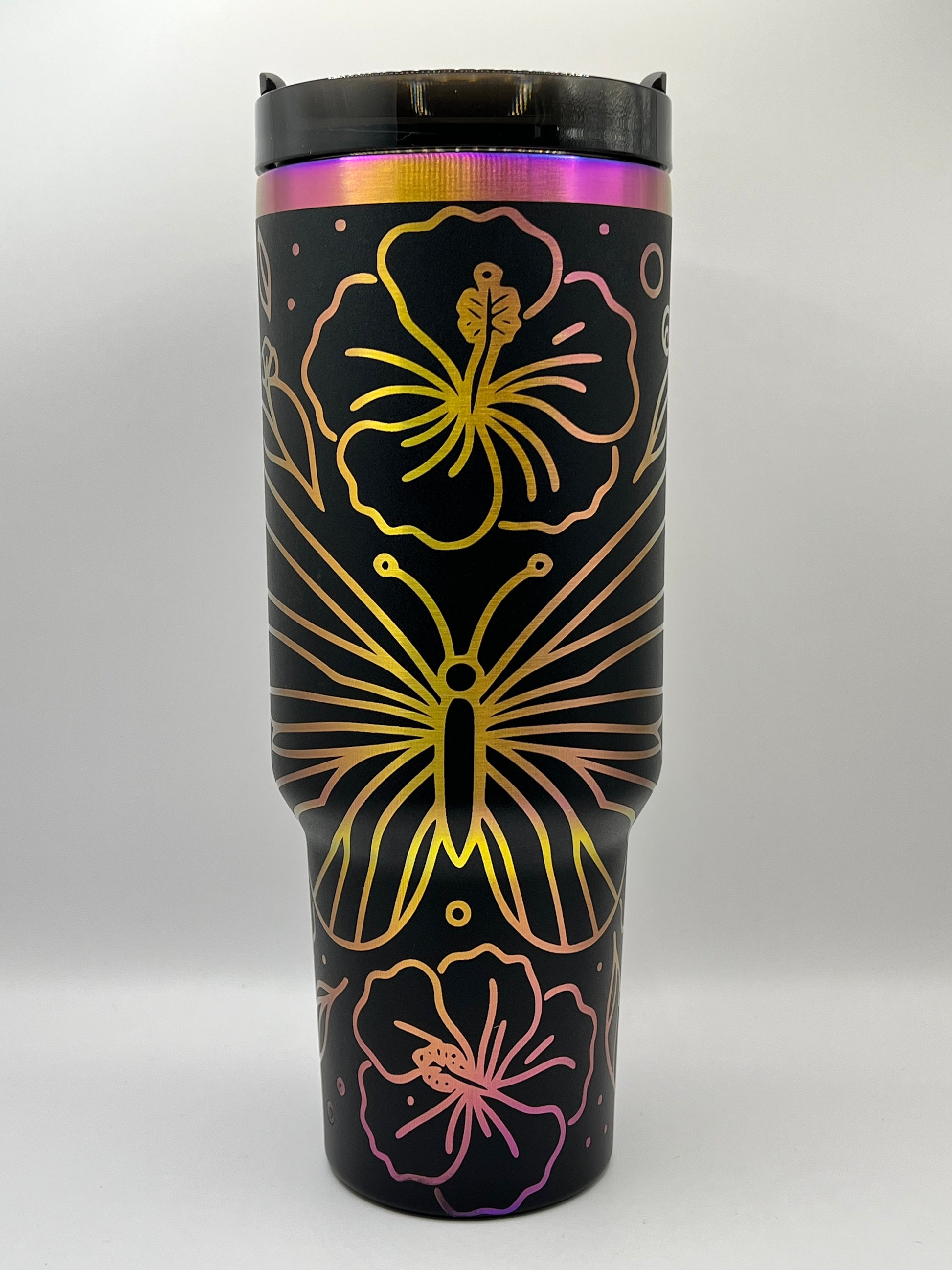 Quench your thirst in style with our 40 oz tumbler featuring a full wrap design of beautiful butterflies and flowers. Enjoy your favorite beverages in this large capacity tumbler, perfect for on-the-go adventures or lazy days at home. Embrace nature's beauty with every sip!