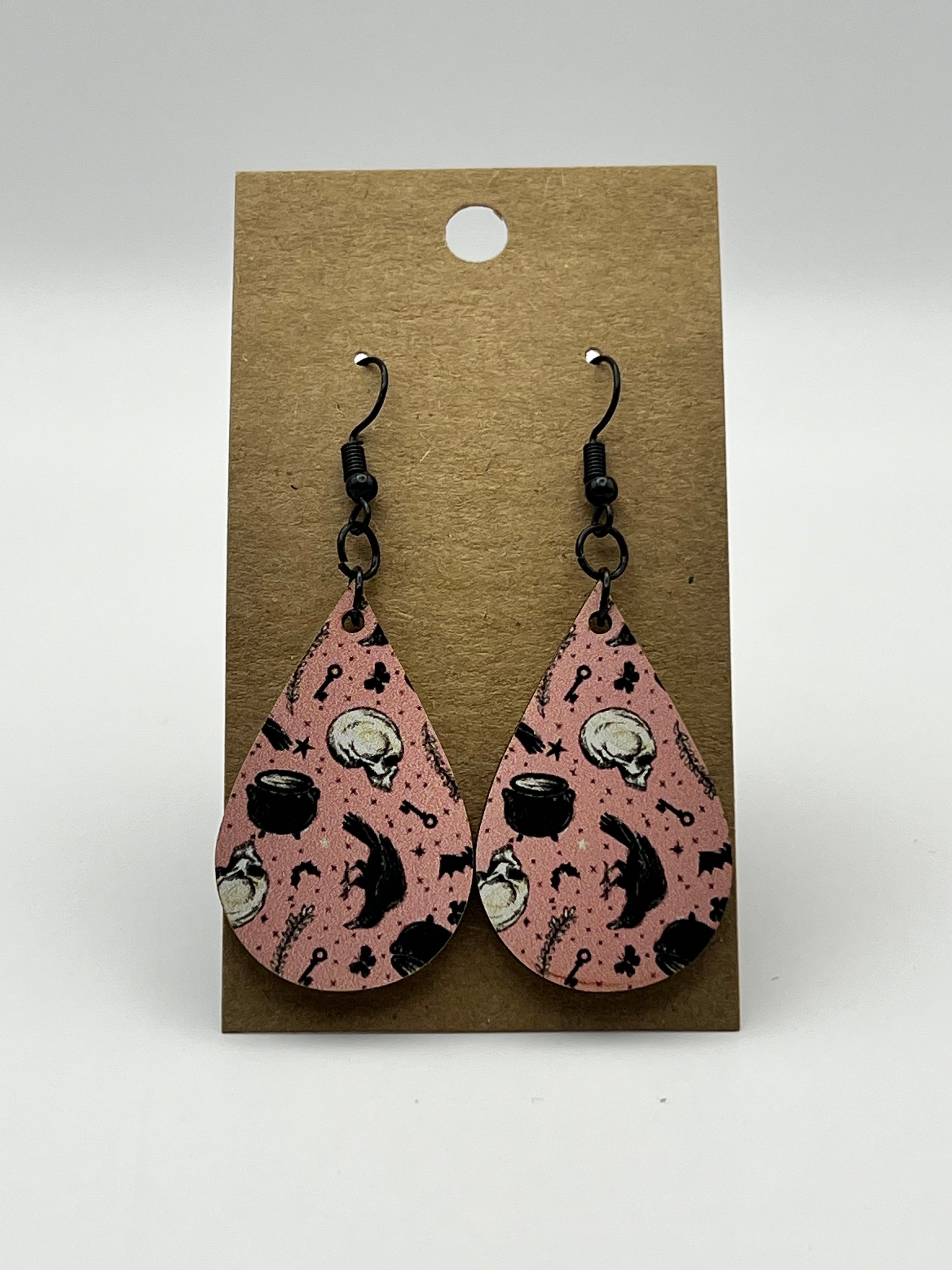 Get ready to brew up some fun with these playful Cauldron and Skull UV Printed Earrings! These pink earrings feature a bold black cauldron and raven design, accented with white skulls. Add a touch of whimsy to any outfit with these unique teardrop earrings. (Don't worry, they won't cast any spells on you!)