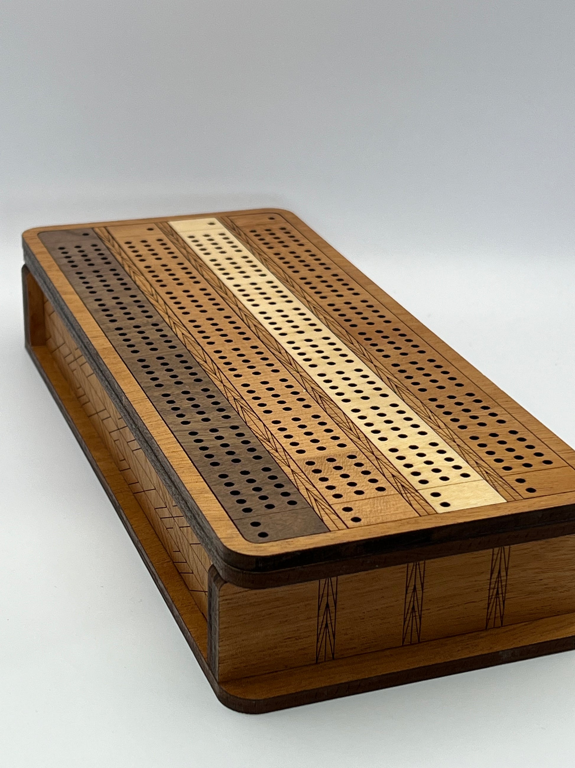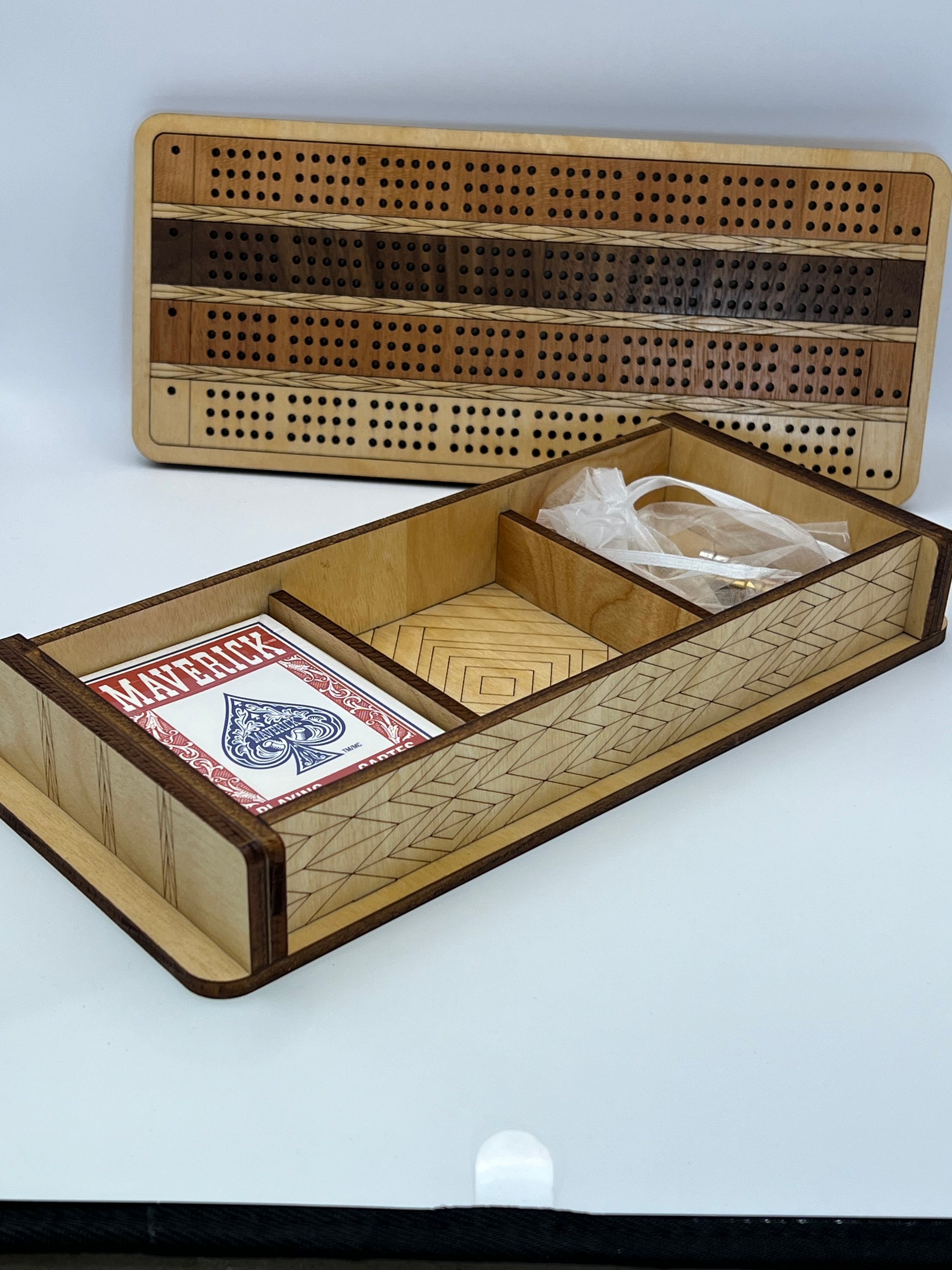 Upgrade your game night with our stunning and practical cribbage board. Made from 4 varieties of premium wood and beautifully engraved, it comes with a deck of cards and metal pegs. Bonus: the box has 3 compartments for storage and the lid doubles as the board! Perfect for game enthusiasts!