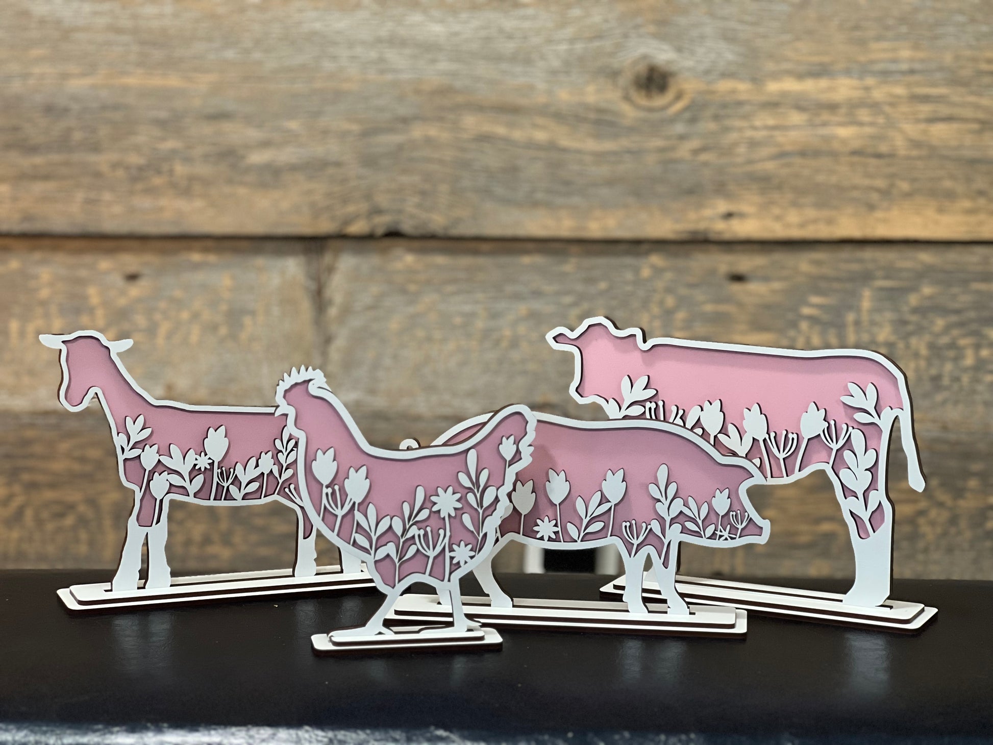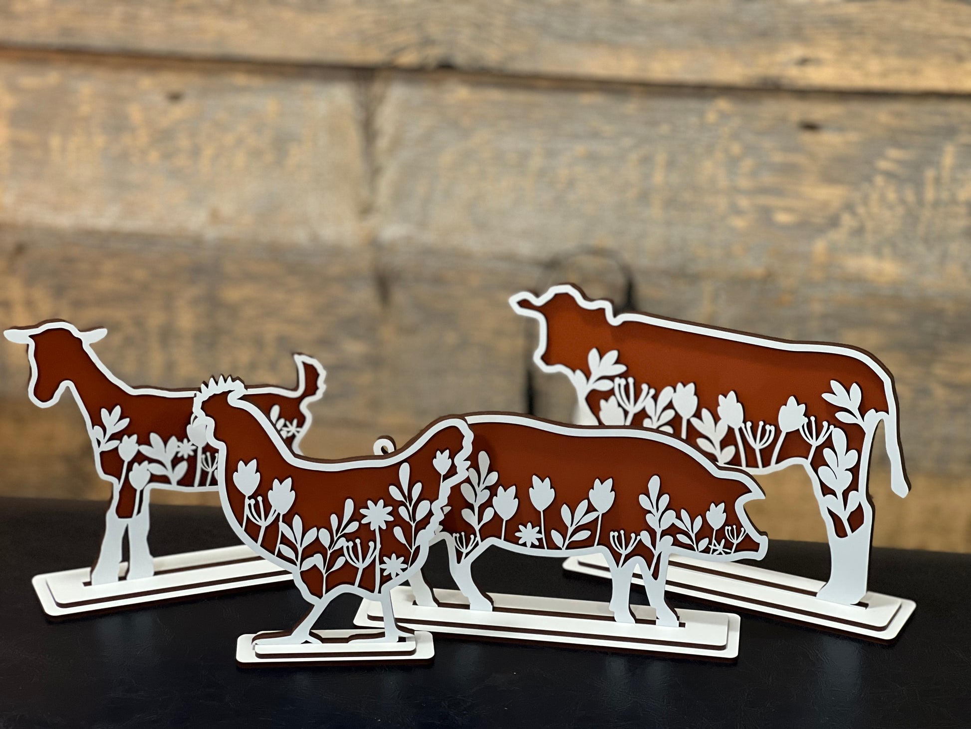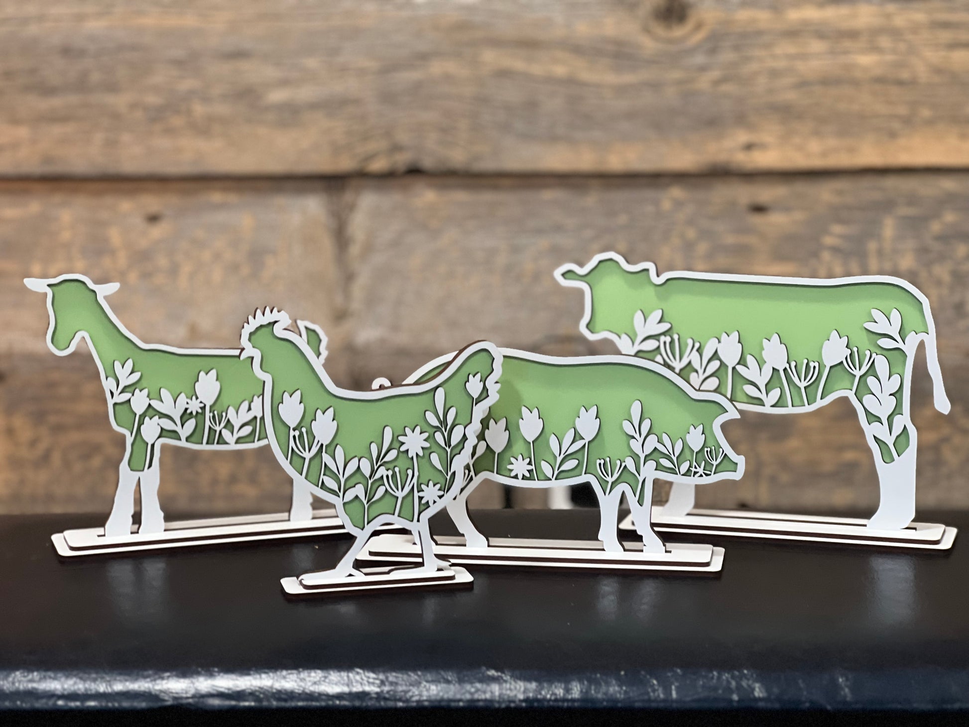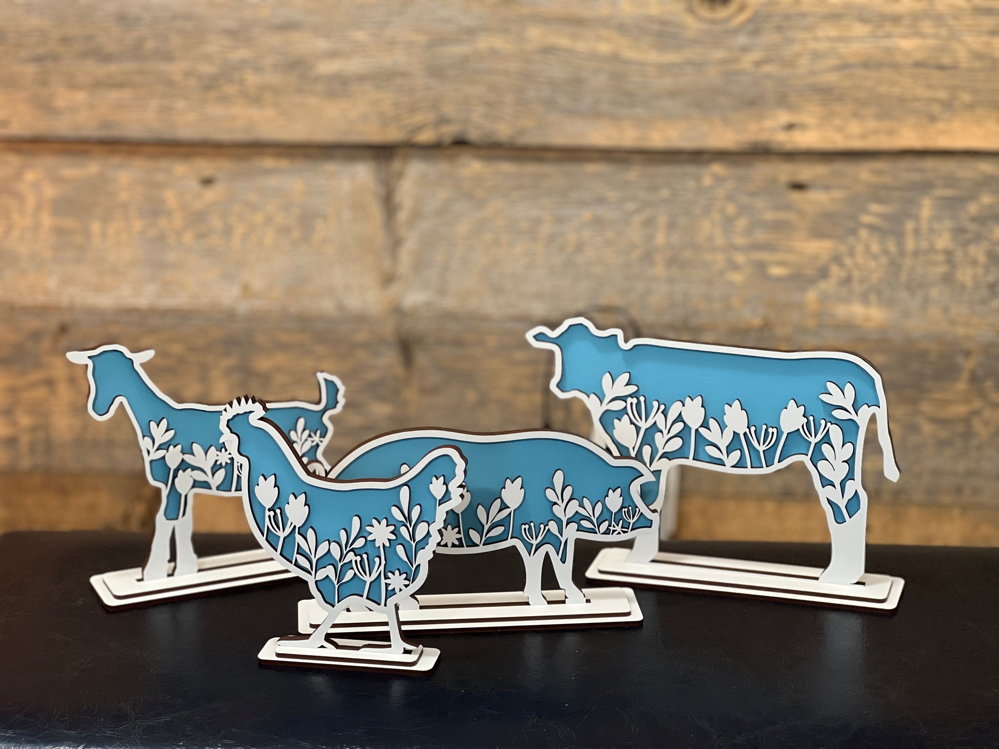 The perfect farmhouse decor to bring your favorite farm animals to your home. Set of 4 including a cow, goat, pig, and chicken with a beautiful floral design. Available in 4 colors: country green, light blue, pale pink, and burnt orange.