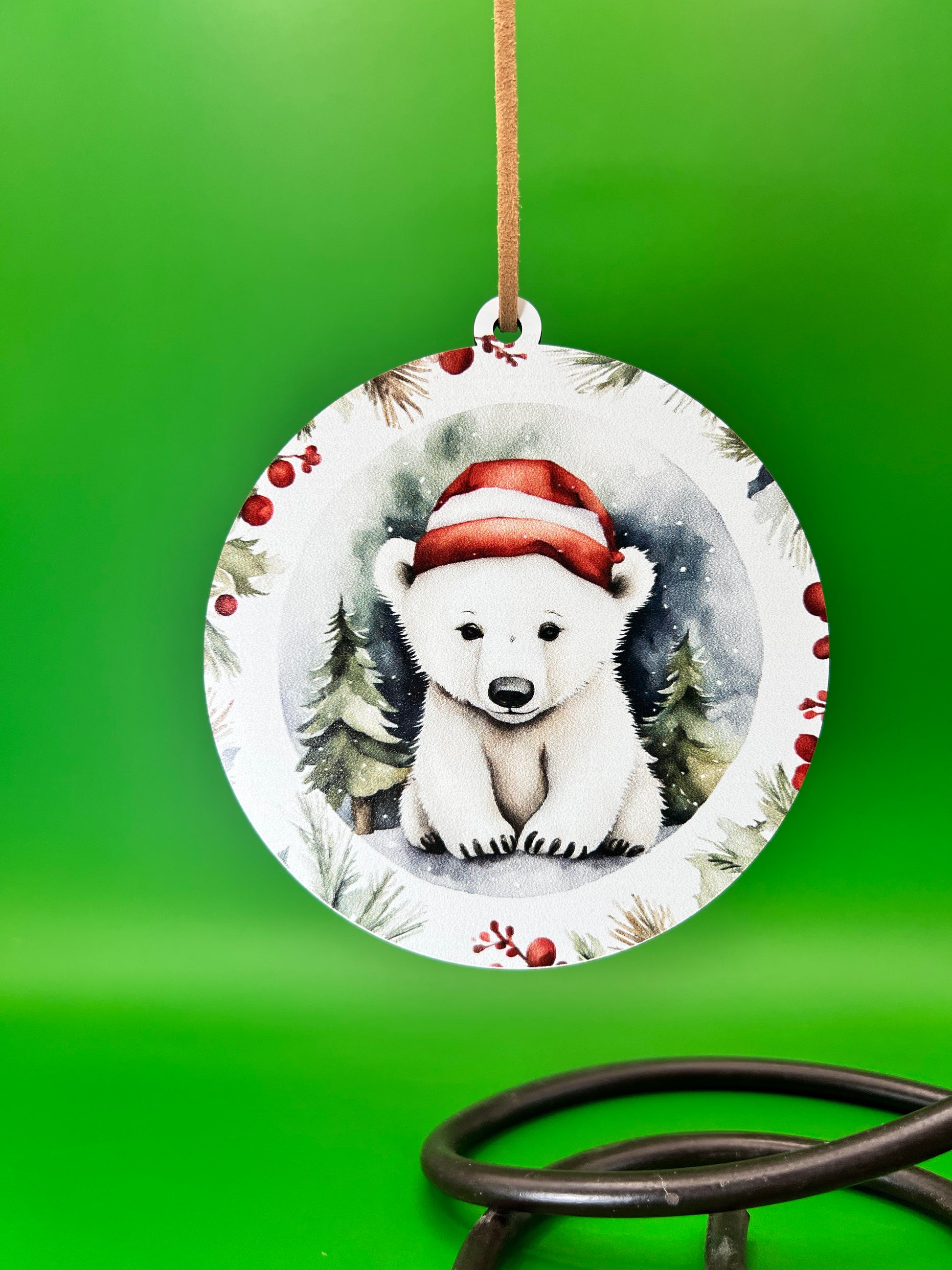 This polar bear ornament brings the beauty of nature to your holiday decor. With stunning UV printing, it showcases 2 designs on a double-sided display, making it the perfect addition to any festive setting. Add a touch of elegance and whimsy to your tree with this charming ornament.