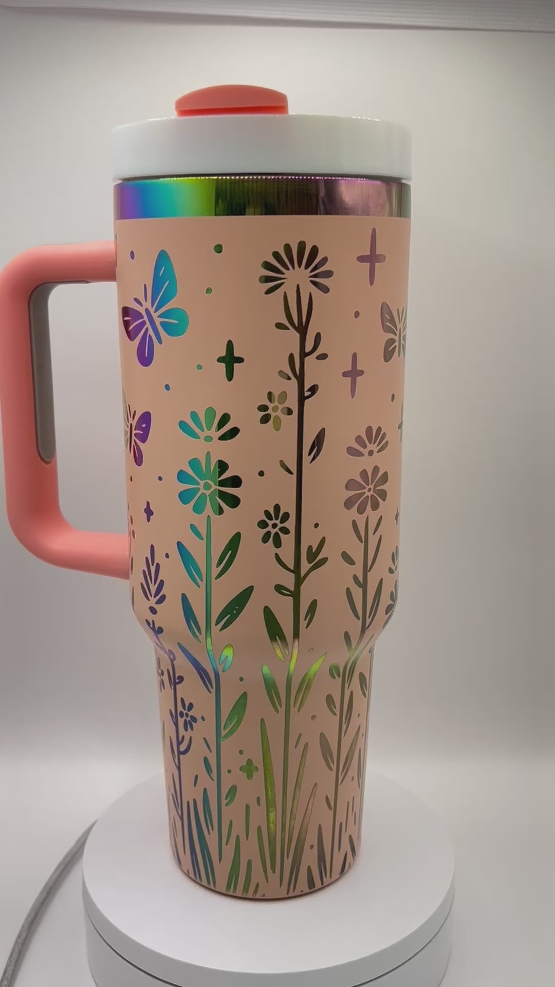 Stay hydrated in style with our Wildflowers and Butterflies 40 oz Tumbler! The peach color and whimsical design featuring rainbow wildflowers and butterflies will brighten your day. Perfect for on-the-go, this tumbler keeps your drink cold for hours.